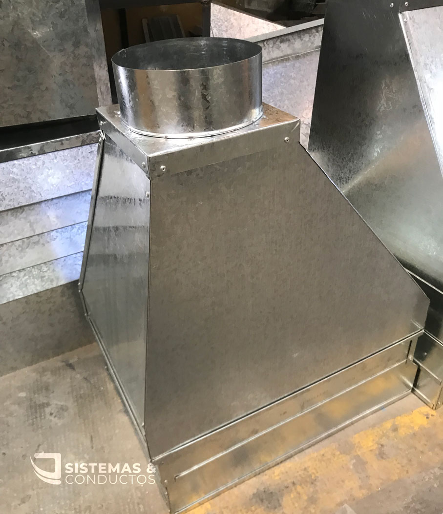 El sistema con colector, cuenta con un pulmón de 40x40cm, dónde inyectan las conexiones de las campanas. Cada ventilación se realiza con caño rígido y debe tener un recorrido minimo de 6 metros para que el tiraje funcione correctamente. Generalmente las últimas dos parrillas ventilan de forma individual ya que no llegan a cumplir con este metraje.